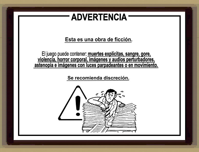 > Contiene: gore, sangre y violencia gráfica, imágenes y audio perturbadores, imágenes parpadeantes que pueden causar astenopia, mención implícita de abuso familiar, entre otros.